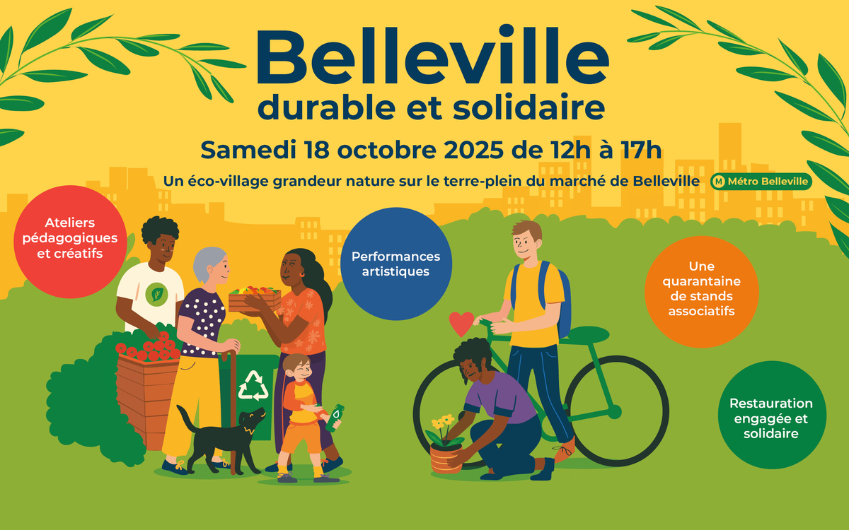 Pour la quatrième année consécutive, les Mairies des 10e, 11e, 19e et 20e arrondissements unissent une fois encore leurs énergies pour proposer une nouvelle édition du festival Belleville durable et solidaire, qui se déroulera le samedi 18 octobre 2025. Vous souhaitez rejoindre l’aventure ? Les candidatures sont ouvertes jusqu’au 6 octobre pour demander un stand !